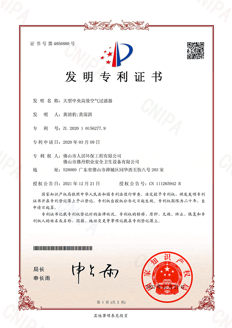 發(fā)明專利證書10:中央除塵系統(tǒng)(人居-2024)